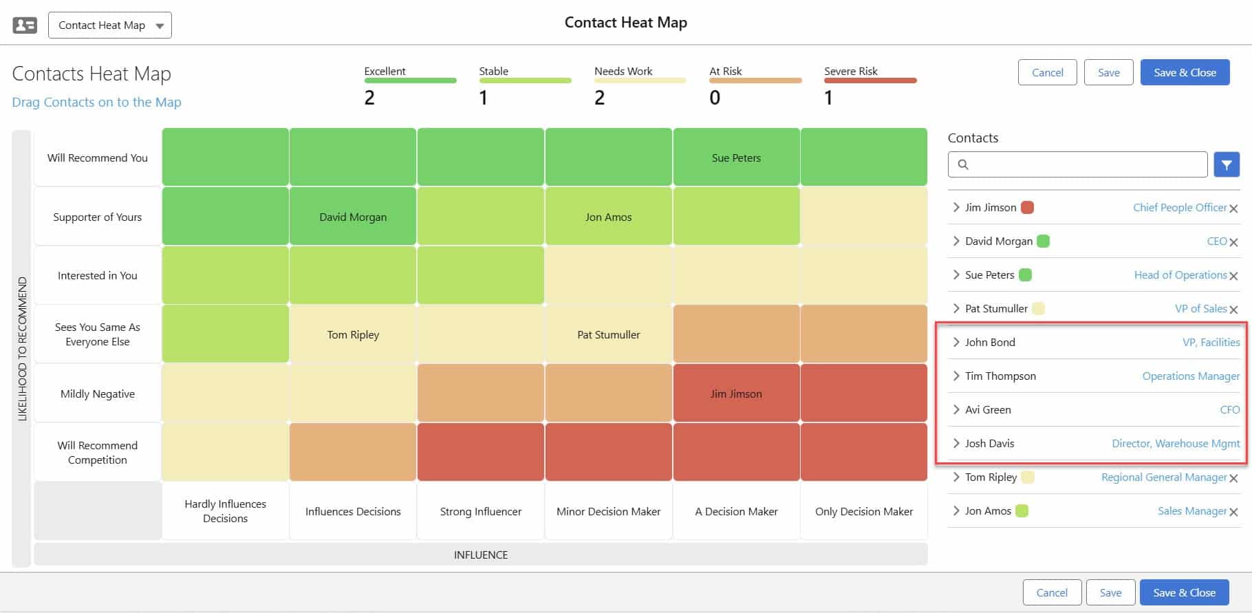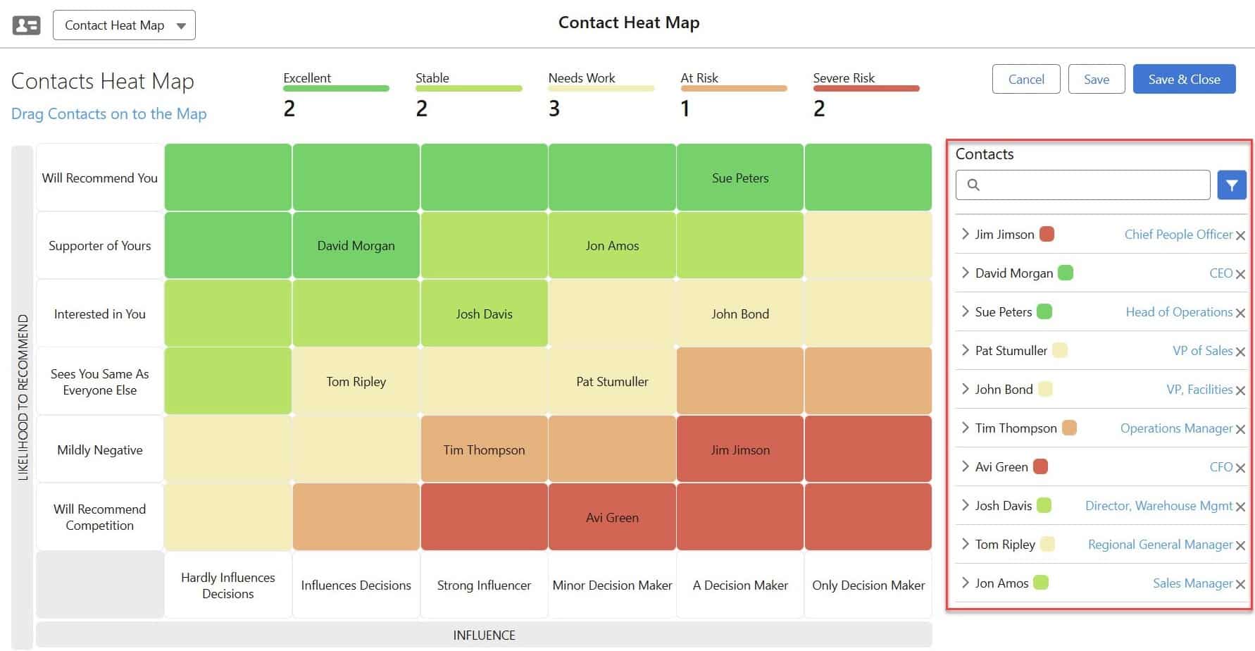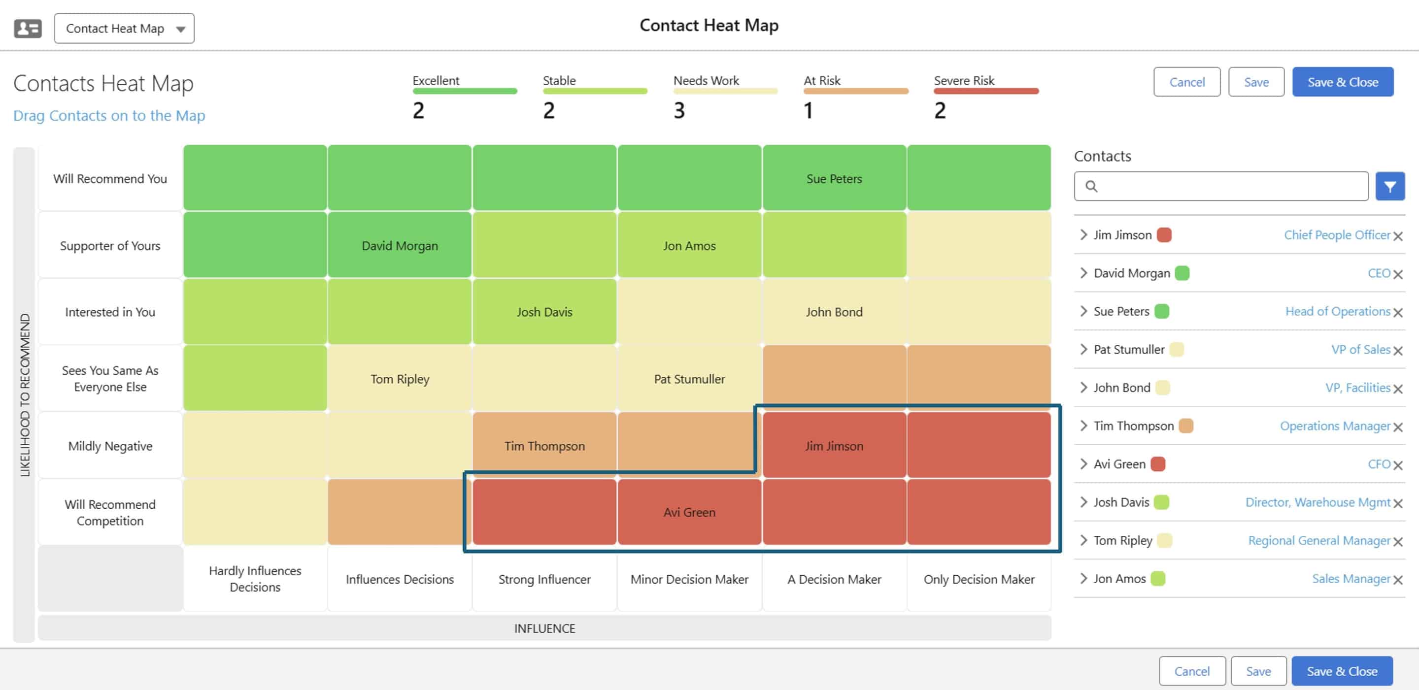 Salespeople and account managers drag and drop Contacts onto the heat map.