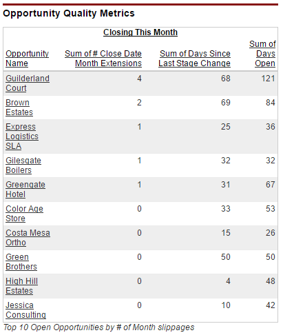 The table presents the Opportunity Name along with three pipeline quality metrics:
