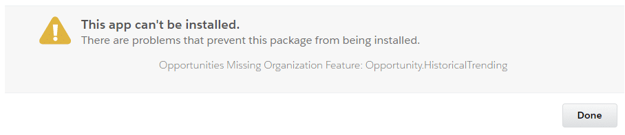 The Historical Trending feature must be enabled to install the dashboard successfully. If you get this error message when installing the GSP Sales Dashboard then Historical Trending is not enabled in your salesforce environment.