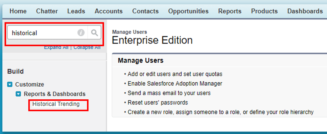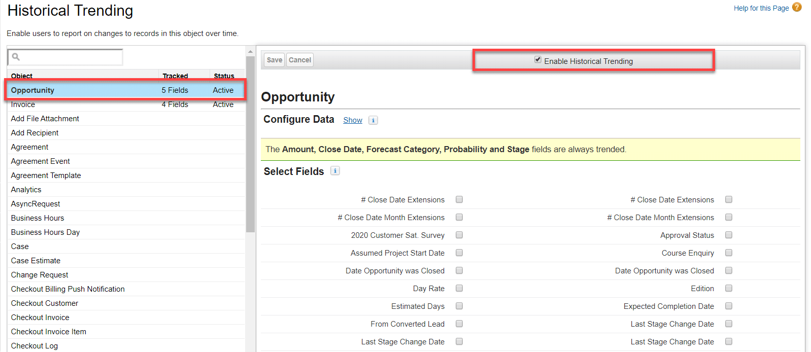 4. Select Opportunity. Check the box marked Enable Historical Trending and Click Save.