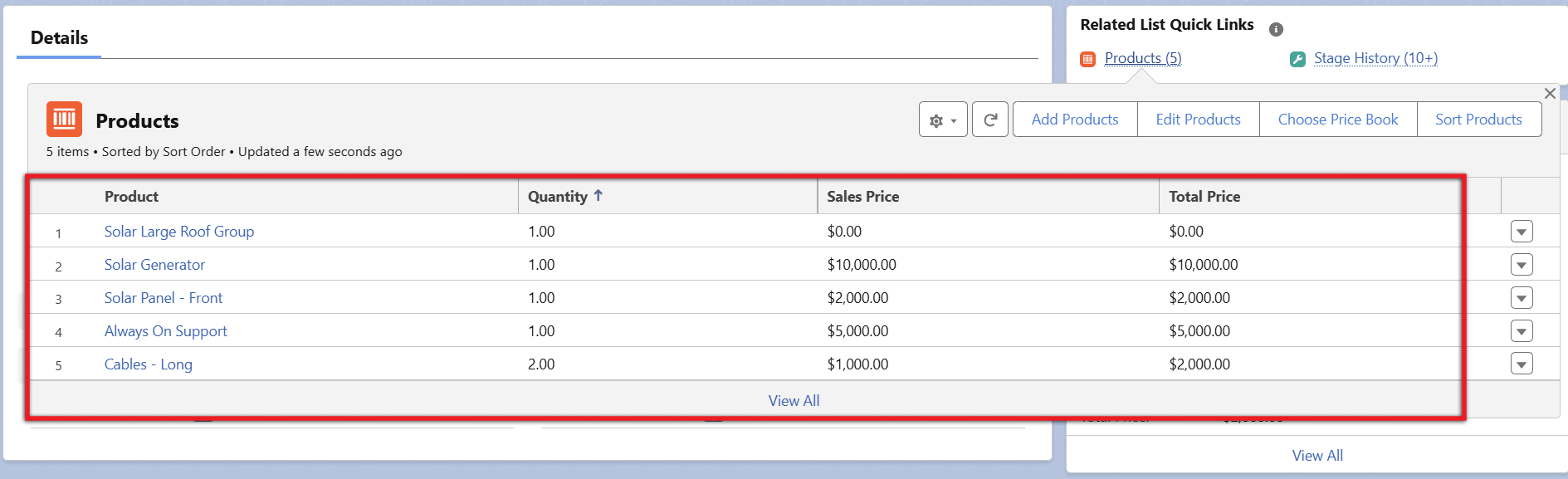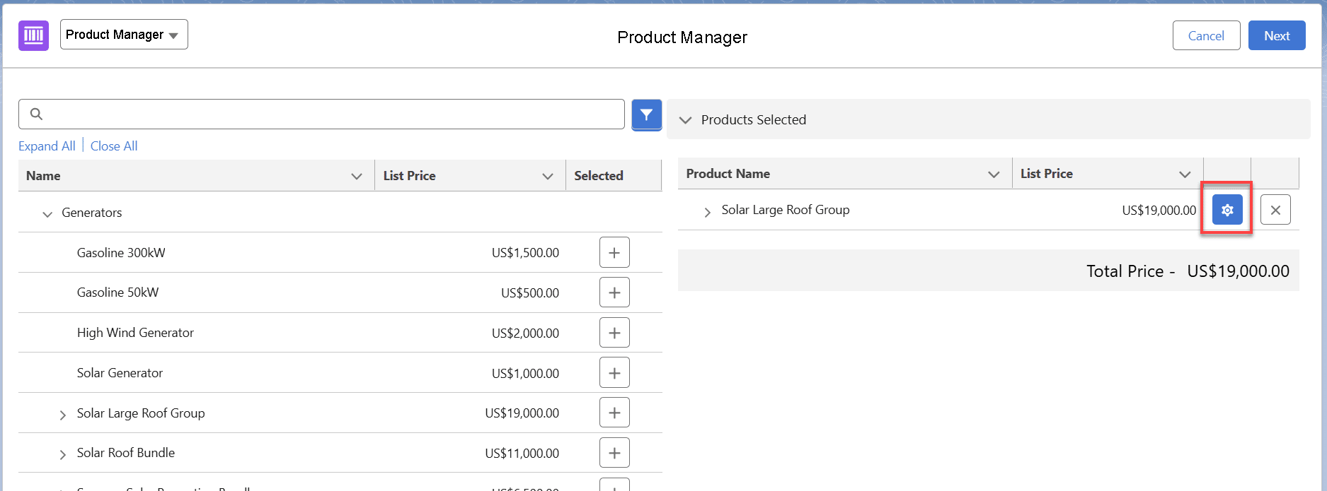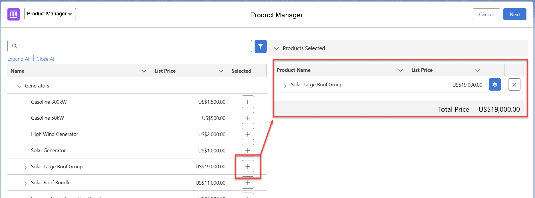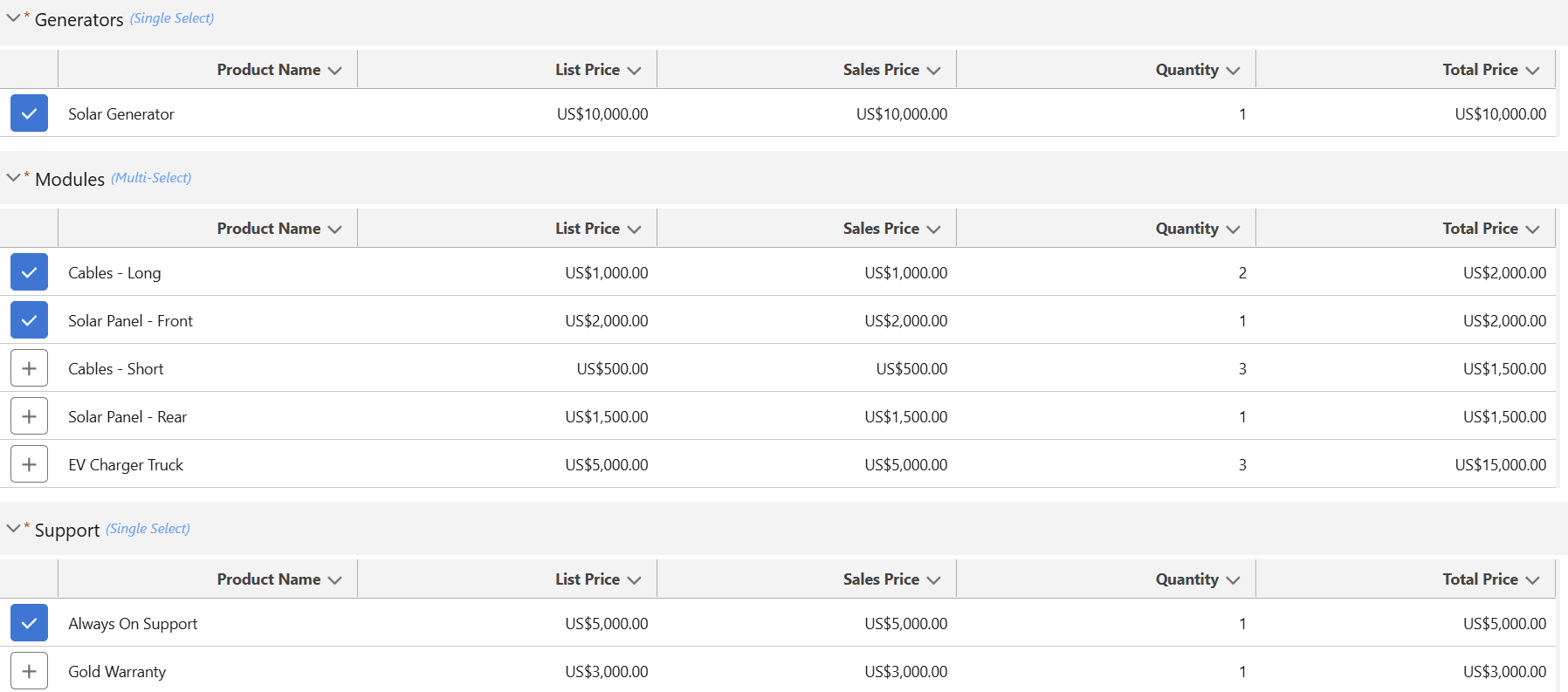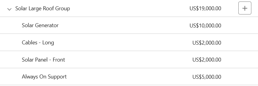 Salespeople can expand each group or bundle; for example, let’s see the details within the ‘Solar Large Roof Group’.