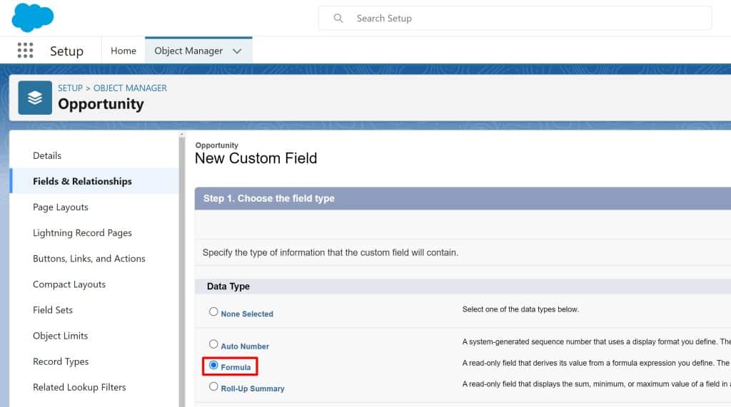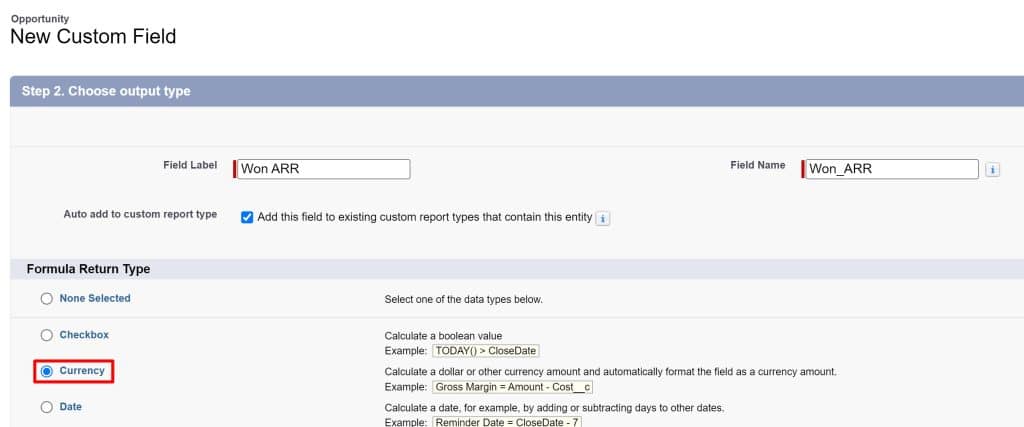 The first step is to create three formula fields with the type of Currency on the Opportunity. These fields will store the won, pipeline, and weighted pipeline values for your custom field.