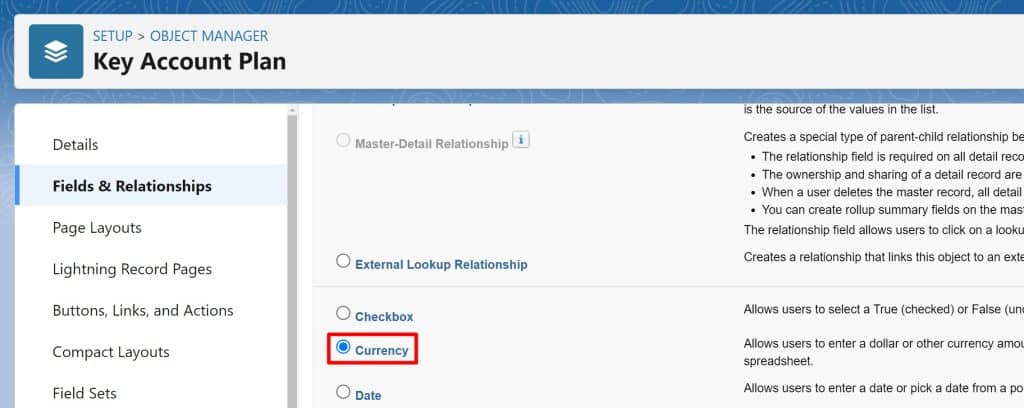 Now, create three new fields on the Key Account Plan object to store the values rolling up from the Opportunity.