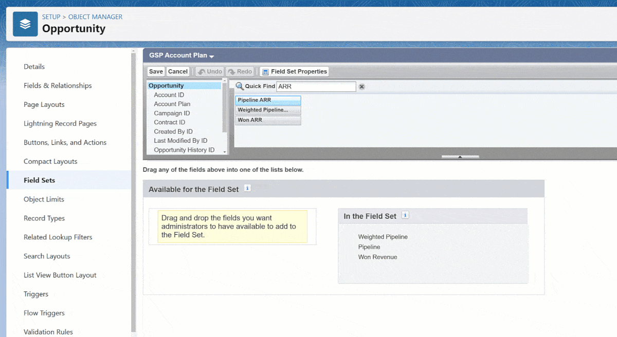 - Add your three newly created Opportunity formula fields to the GSP Account Plan Field Set on the Opportunity.