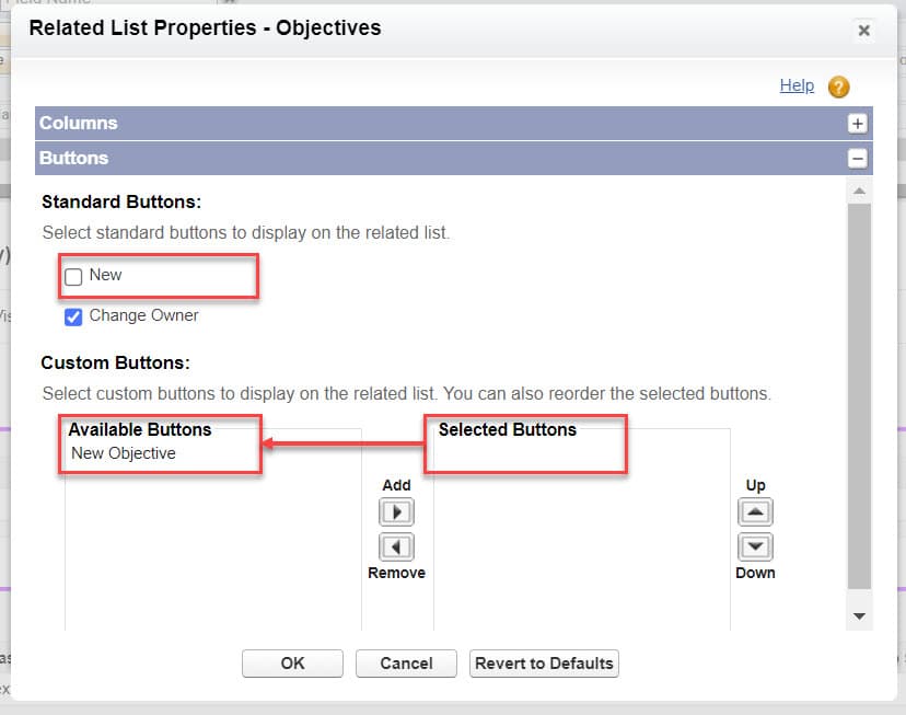 7. Move “New Objective” from Selected Buttons to Available Buttons, and uncheck the New checkbox. Click OK.