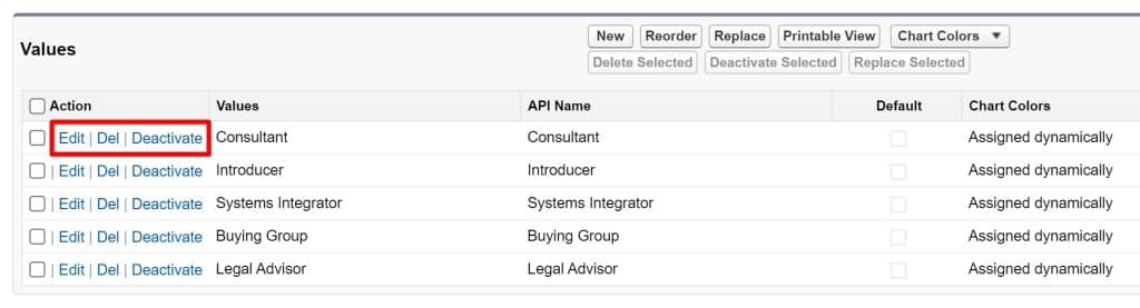 - Modify the picklist in the Values section by using the new, edit, or delete options.