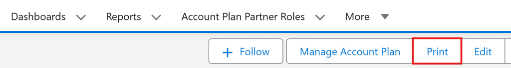 Printing your Key Account Plans can be important. You can take them to important stakeholder meetings or use them in collaborative sessions. The standard SFDC print functionality is poor quality, so we have created a bespoke print function.