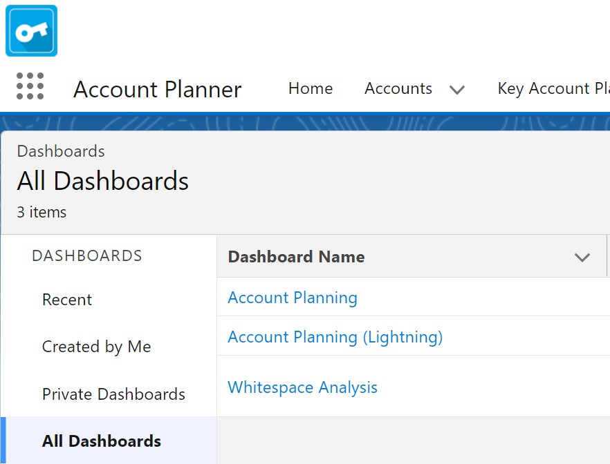 The app includes two unique dashboards you can find by clicking on the Dashboards tab, All Folders on the left, and Account Planning.