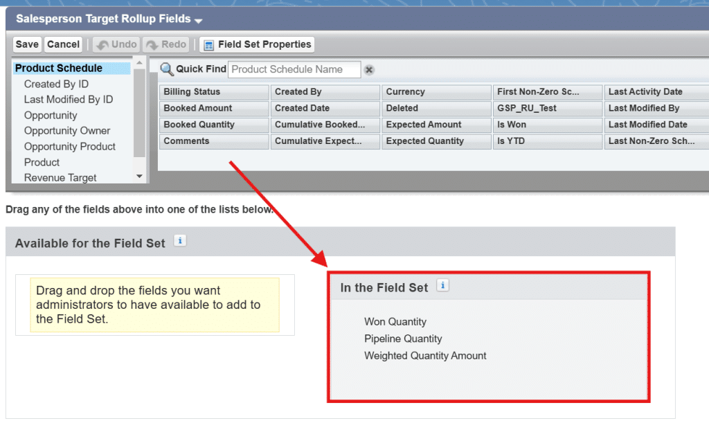 - Finally, add the fields you created on the Product Schedule to the Salesperson Target Rollup Fields field set and/or the Team Target Rollup Fields field set.