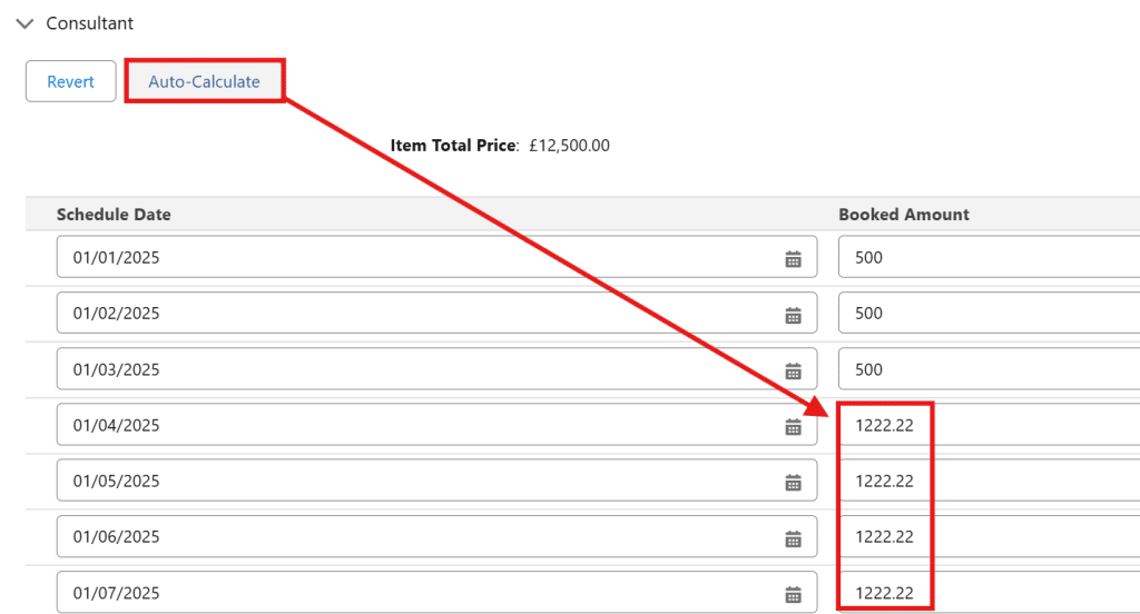 - Alternatively, click the Auto-Calculate button to redistribute the difference across the schedules you have not modified. This will align the sum of the schedules to the Line Item Total Price.
