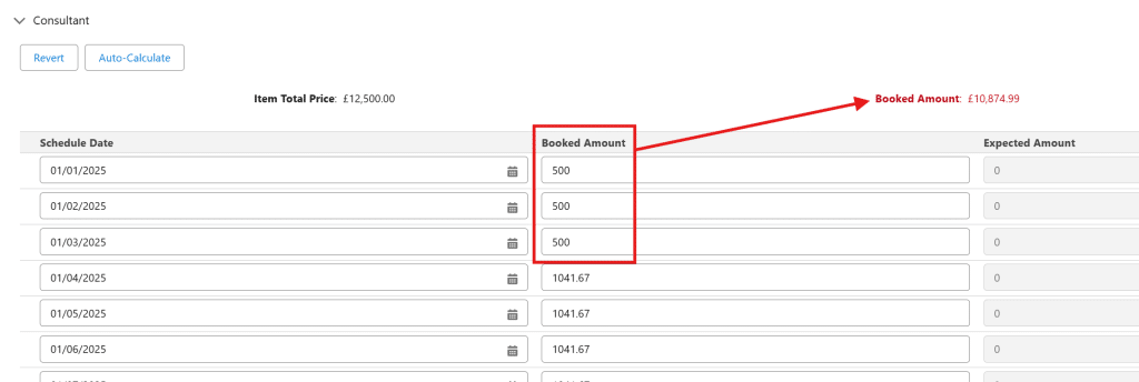 When amending a schedule value, the Line Item Total Price and Booked Amount will be out of sync. You will know when this happens as the Booked Amount turns red.