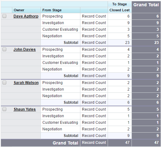 This report shows the ‘From’ Stage for all deals that have been set to Closed Lost for each salesperson.