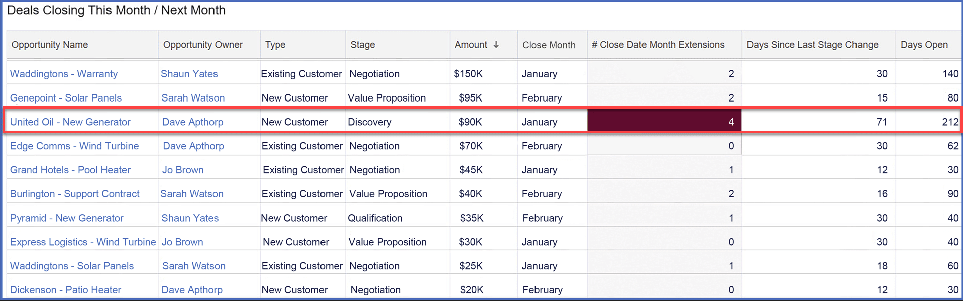 - Watch for high-risk deals: pay special attention to opportunities with 3+ Close Date Extensions (highlighted in red). Deals that repeatedly slip are less likely to close successfully.