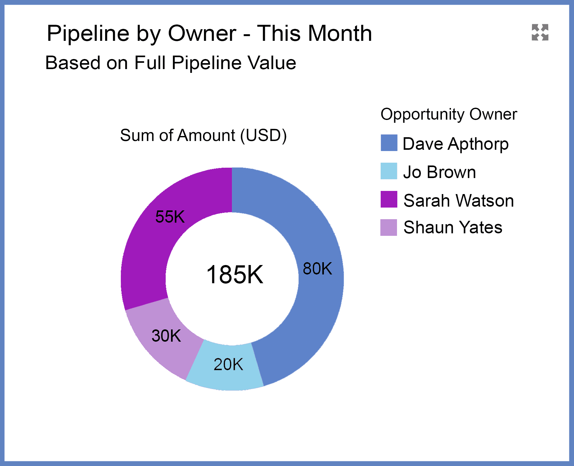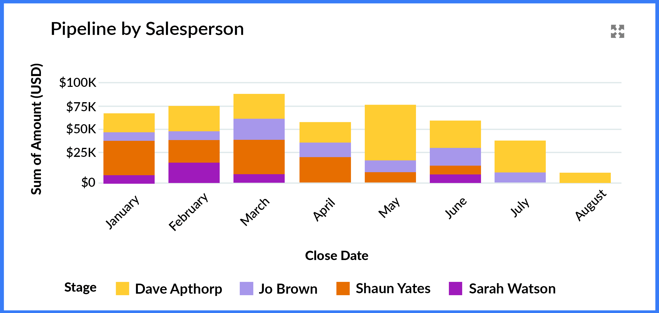 This chart adds further insight by stacking the pipeline by the opportunity owner, so you can see who drives short- and long-term revenue opportunities.