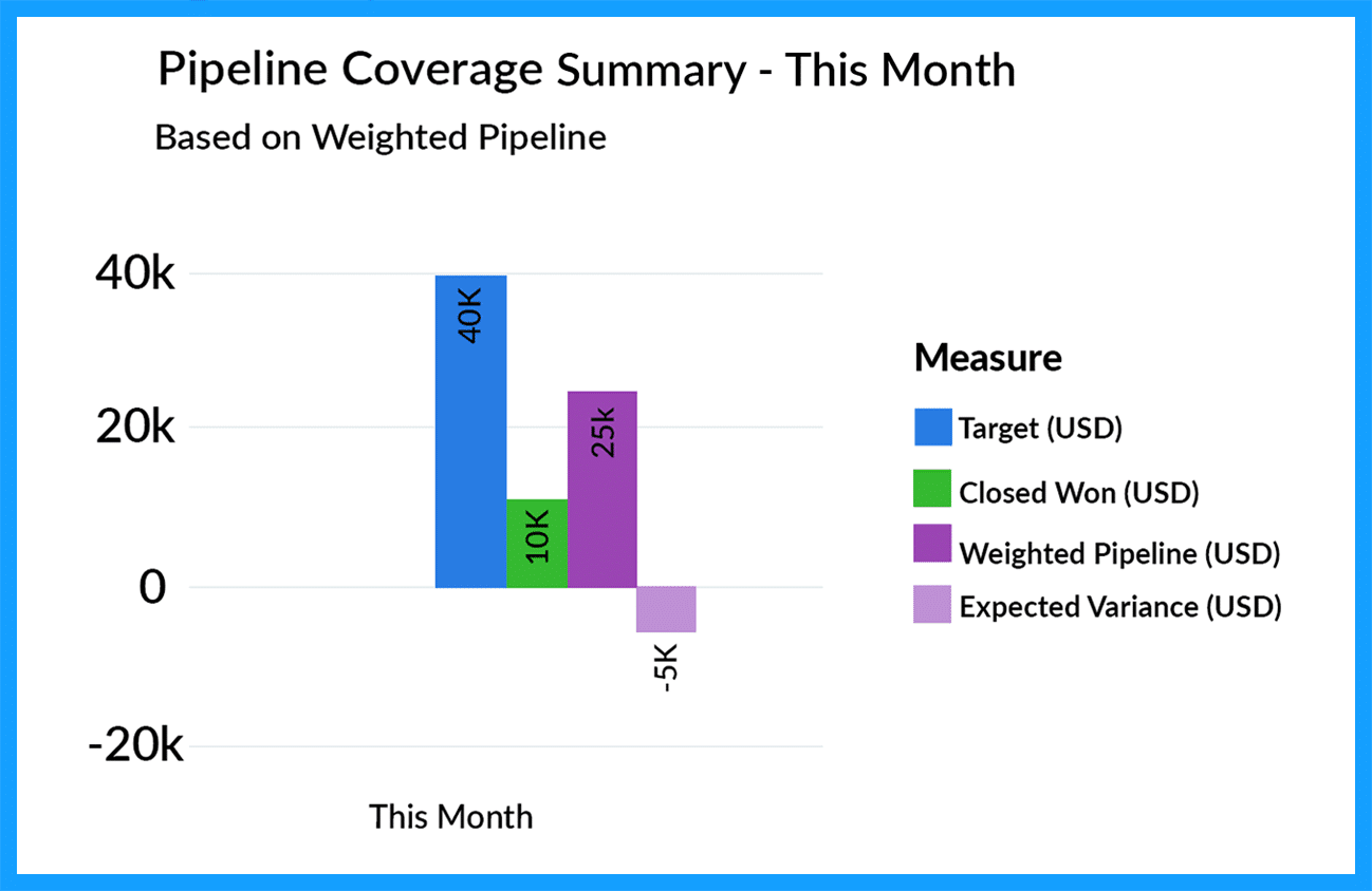 The Pipeline Coverage Summary chart provides a real-time snapshot of whether your current funnel coverage is sufficient to hit the sales targets. For example, a negative variance indicates a shortfall, meaning you must act to close the gap.