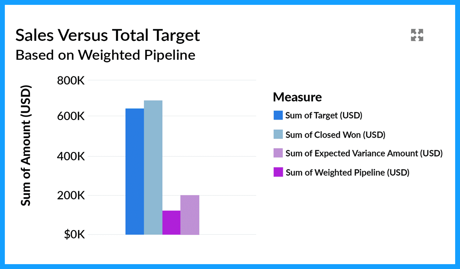 - Expected Variance: the gap between the sales target and Expected Revenue (the combined total of Deals Won and the Weighted Pipeline).