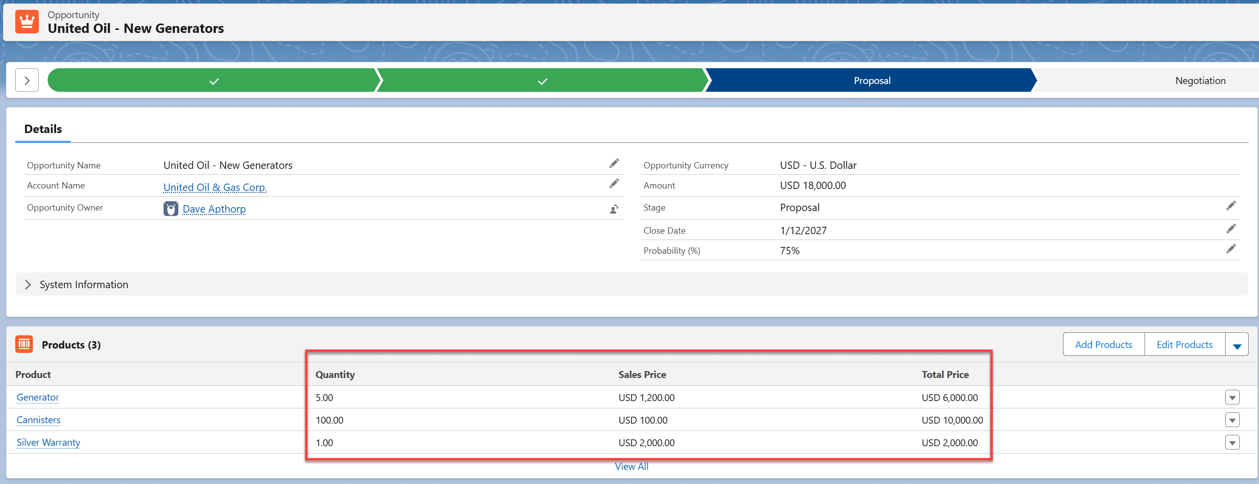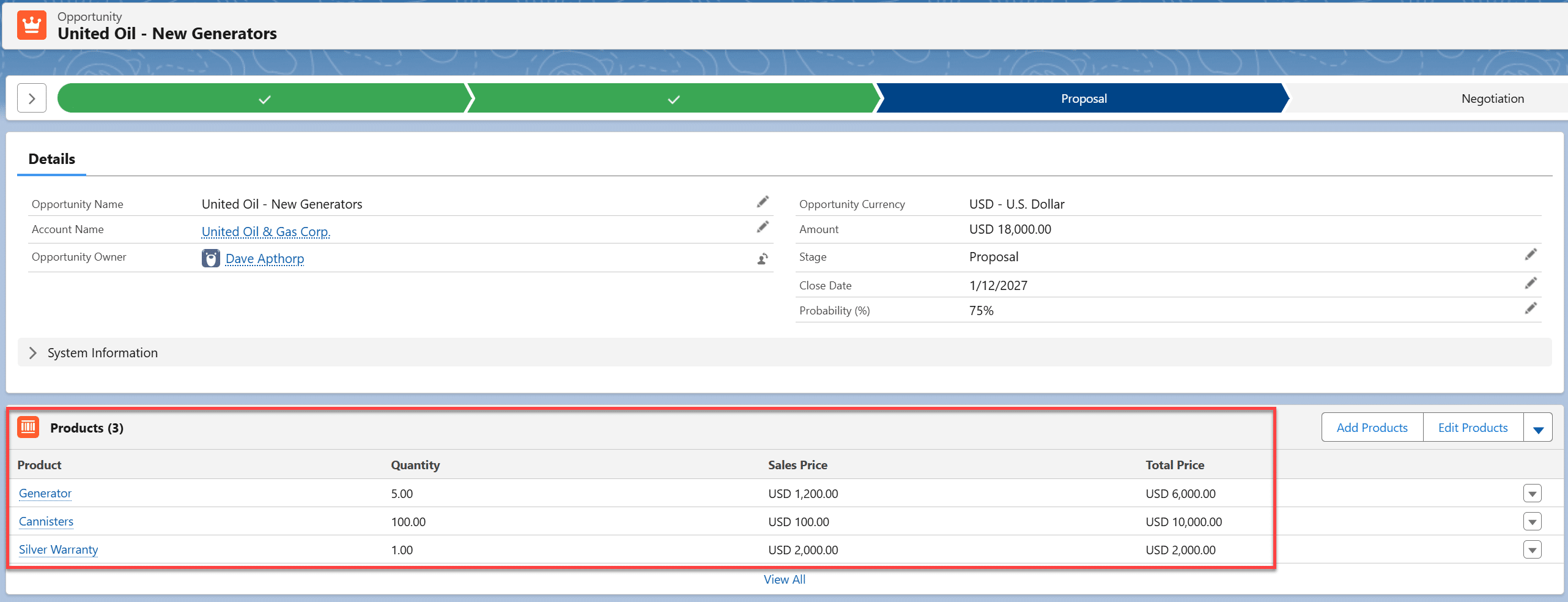 In this example, the three opportunity products represent a combination of physical goods and services the company provides.