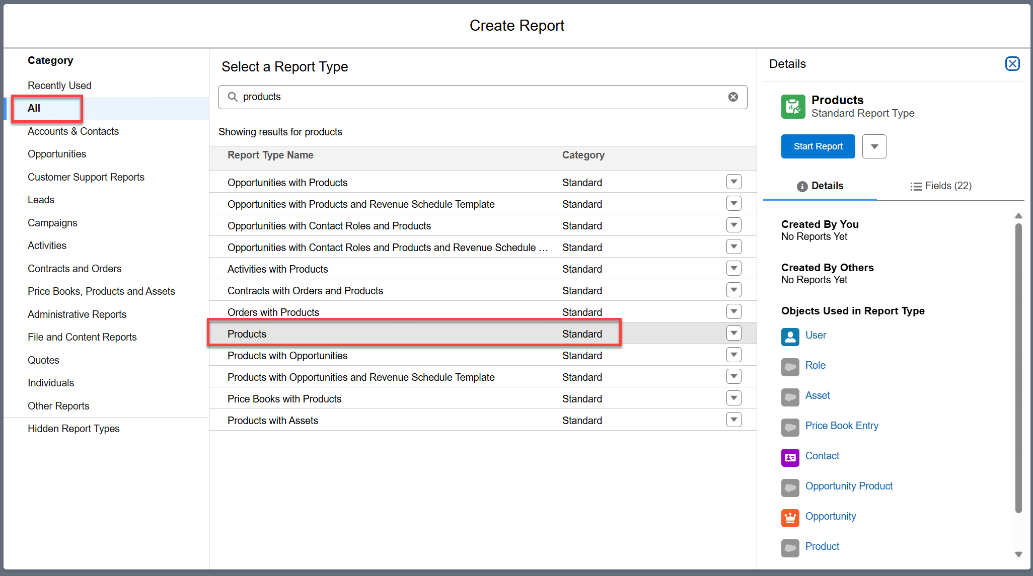 You can report on Products in Salesforce using Report Type, Products. Tip: Select ‘All’ as the Category on the left and side to see the Report Type.
