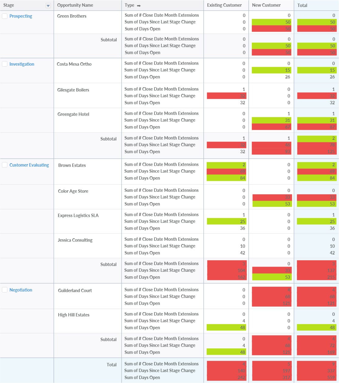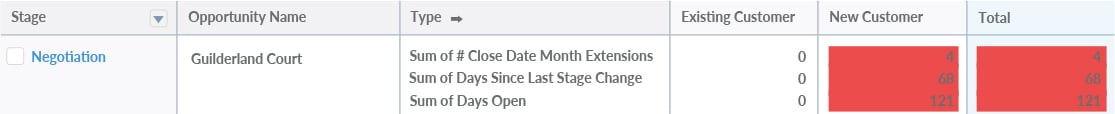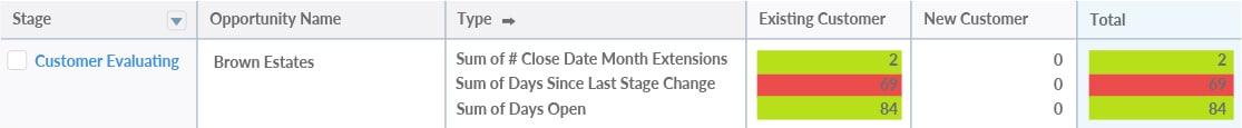 Now, suppose the Close Date has already slipped from one month to another four times. It’s in the final Negotiation Stage, but it’s been there for over two months. What’s more, the Opportunity has been open for 180 days.