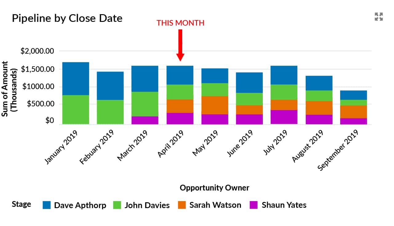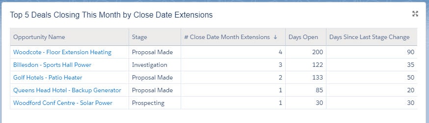 In this example there are open deals where the Close Date is in an earlier month. So unless the salesperson has a Hogwarts time-turner, these opportunities are not going to close in a previous month.