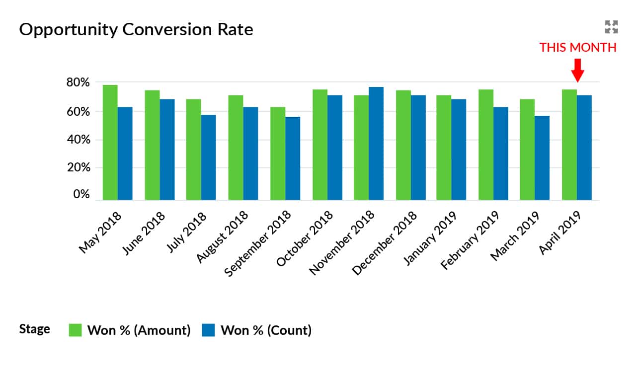 For example, let’s say that in April you win three deals, and lose seven. That means your conversion rate is 30%. However, deals that are never going to be won are often not set to lost in the system.