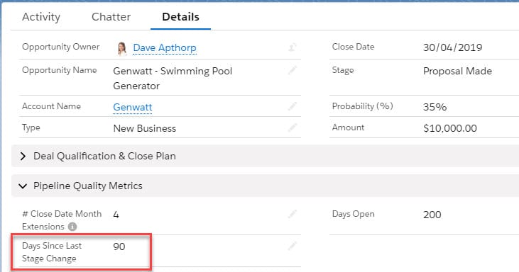 This sales metrics counts the number of days since the Opportunity Stage was last updated.