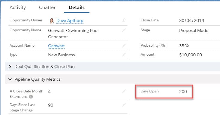 XXX, for example, has been open 200 days. It’s still at the Proposal Stage. In fact, the Stage hasn’t been updated for 90 days. And the deal has slipped from one month to the next three times already.