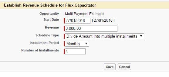 This will create an initial recurring revenue schedule of 4 payments @ £750. However the sales person now has a chance to modify the date and amount of each schedule.