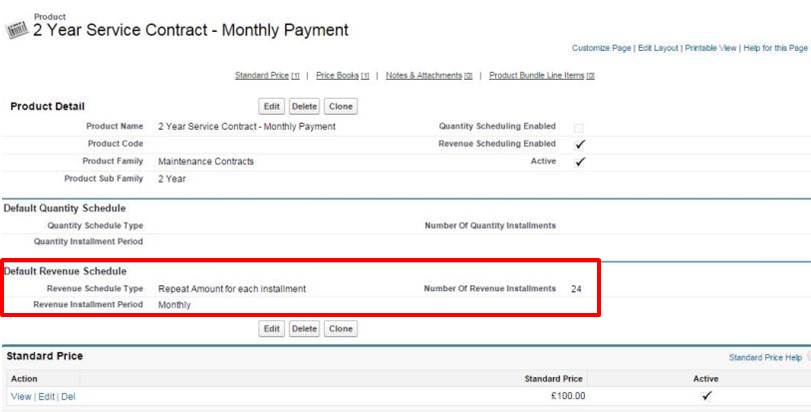 For example, the product that represents the 2-year service contract with monthly payments, has a default of 24 revenue schedules. The 3-year, annual payment service contract has default of 3 revenue schedules. And so on.