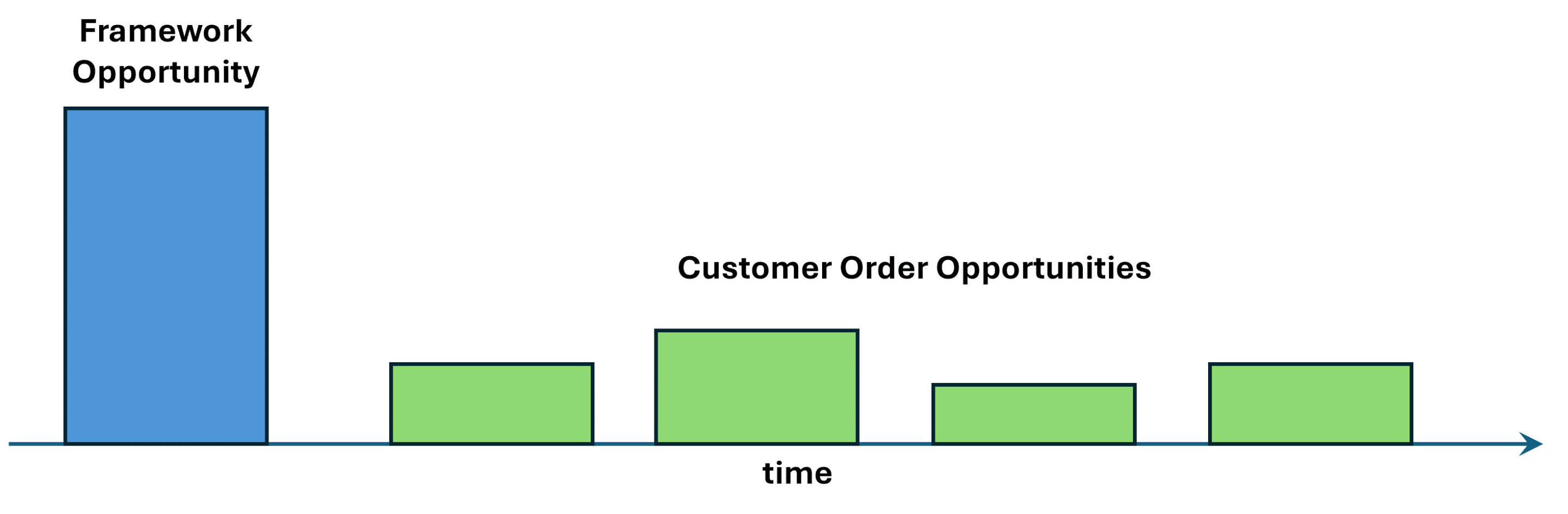 Each opportunity has its own sales process with activities relating to technical specifications, delivery, stakeholder management, and fulfilment. However, the framework agreement covers the main terms, conditions, and pricing.