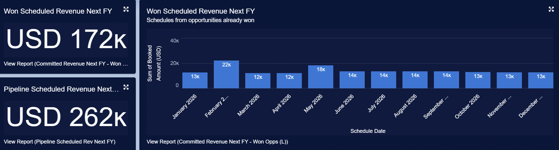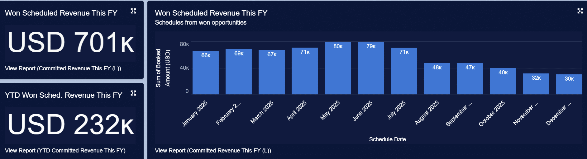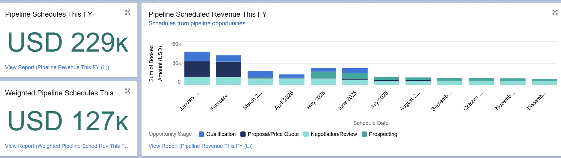 Scaling this up using reports and dashboards that span multiple opportunities delivers visibility of our overall revenue recognition.