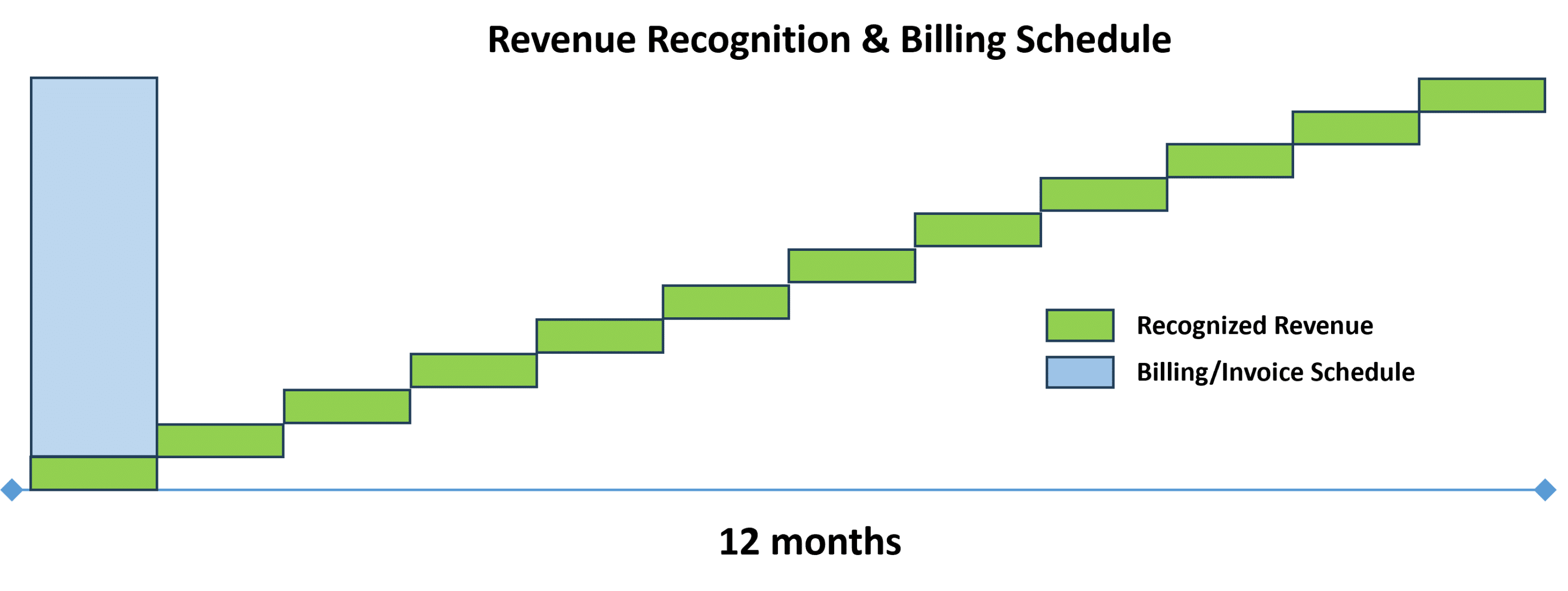 For example, for a 12-month service contract, revenue recognition occurs monthly, while the billing could be monthly, quarterly, or upfront.