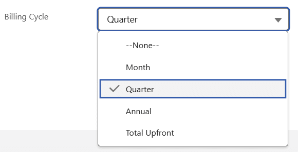 When users populate this picklist, a flow automatically generates the billing schedules. Remember to inform the flow of the start date to use for the billing schedules (such as the opportunity close date) and to adjust the schedules accordingly if the start date changes.
