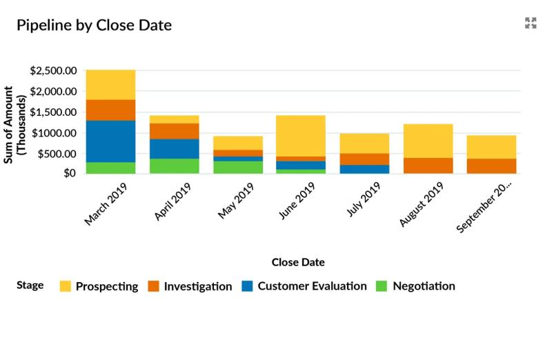 Let’s suppose we are at the beginning of March 2019. The dashboard chart shows there is $2.5 million due to close this month. Now, let’s assume the typical sales cycle is three months. In that case, can deals in the Prospecting and Investigation Stages can be relied upon to close successfully this month? - Negotiation Stage.