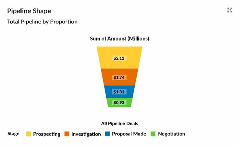 The funnel chart is an excellent way to check whether the pipeline is in proportion. In other words, does the overall shape of the funnel look healthy?