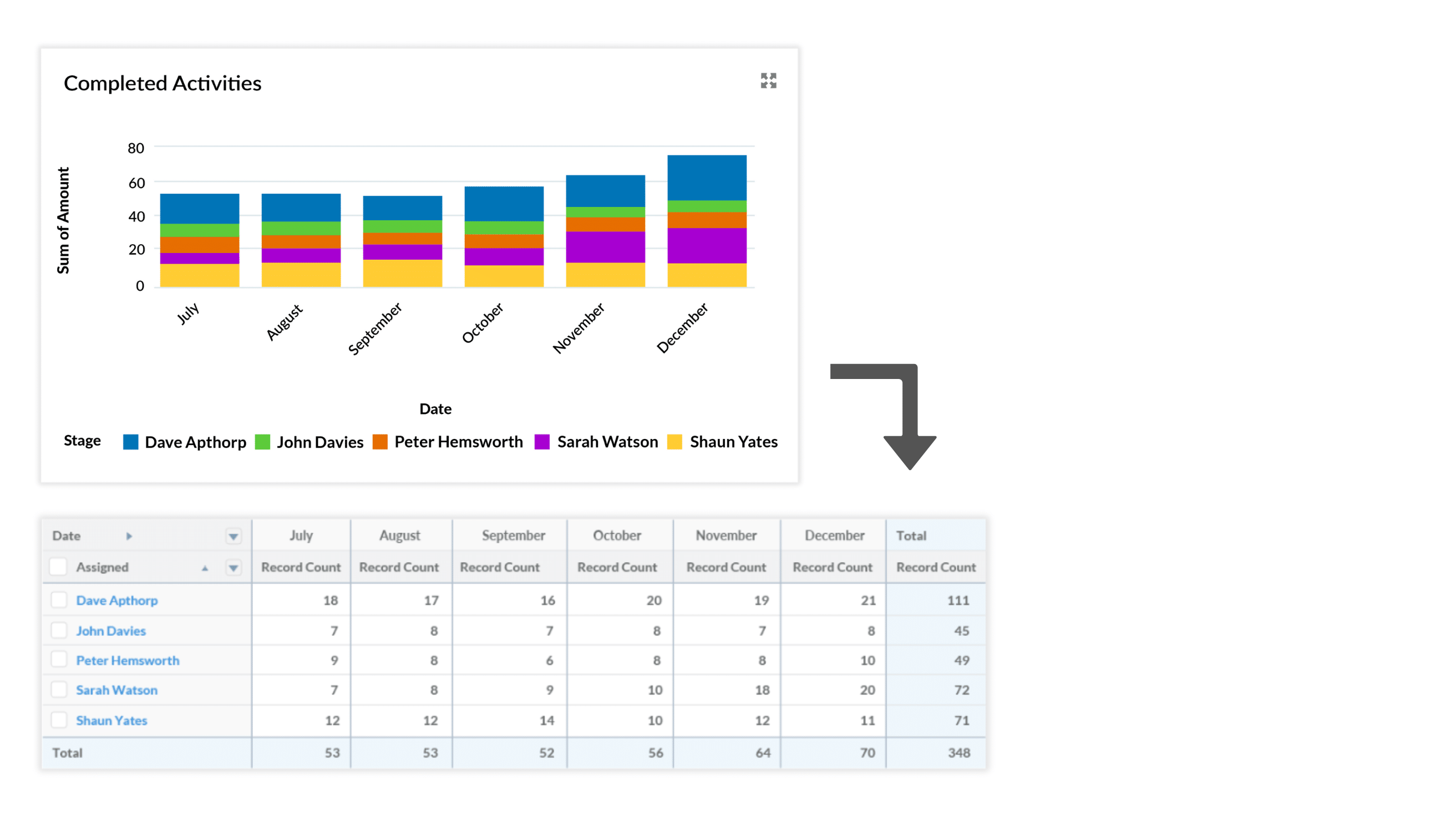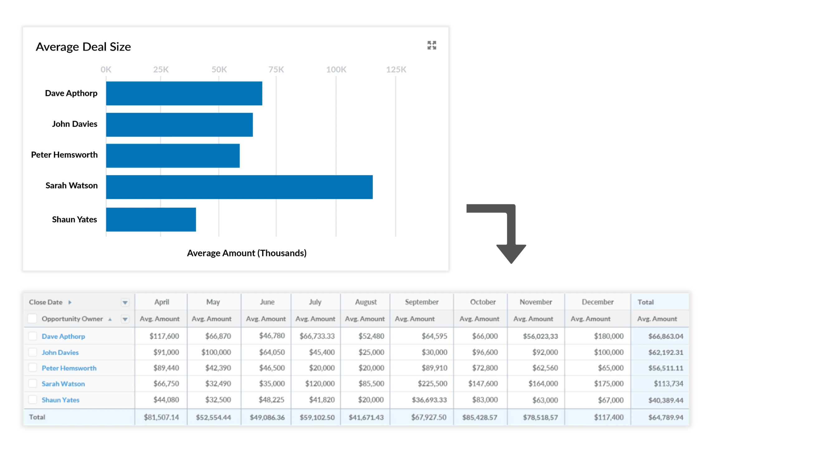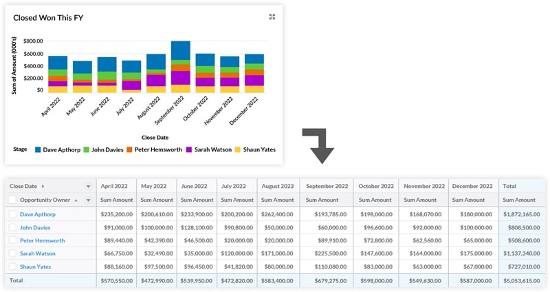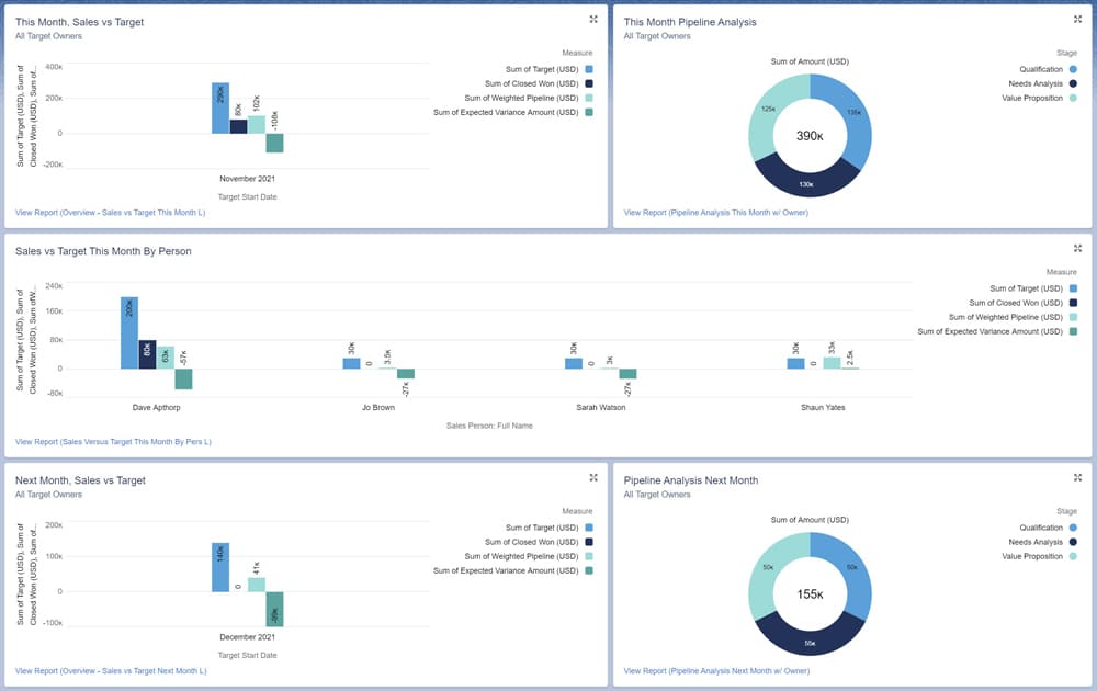 In this example, the dashboard chart and report both sum the data by each salesperson. You may want to create report variations that group the data by team, country, or territory.