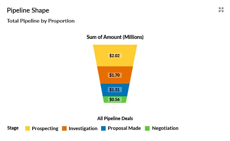 Look at the example below. The $ value of deals in the Investigation stage is less than the $ Amount of opportunities in Proposal Made. The next opportunity stage has more funnel than the earlier stage.