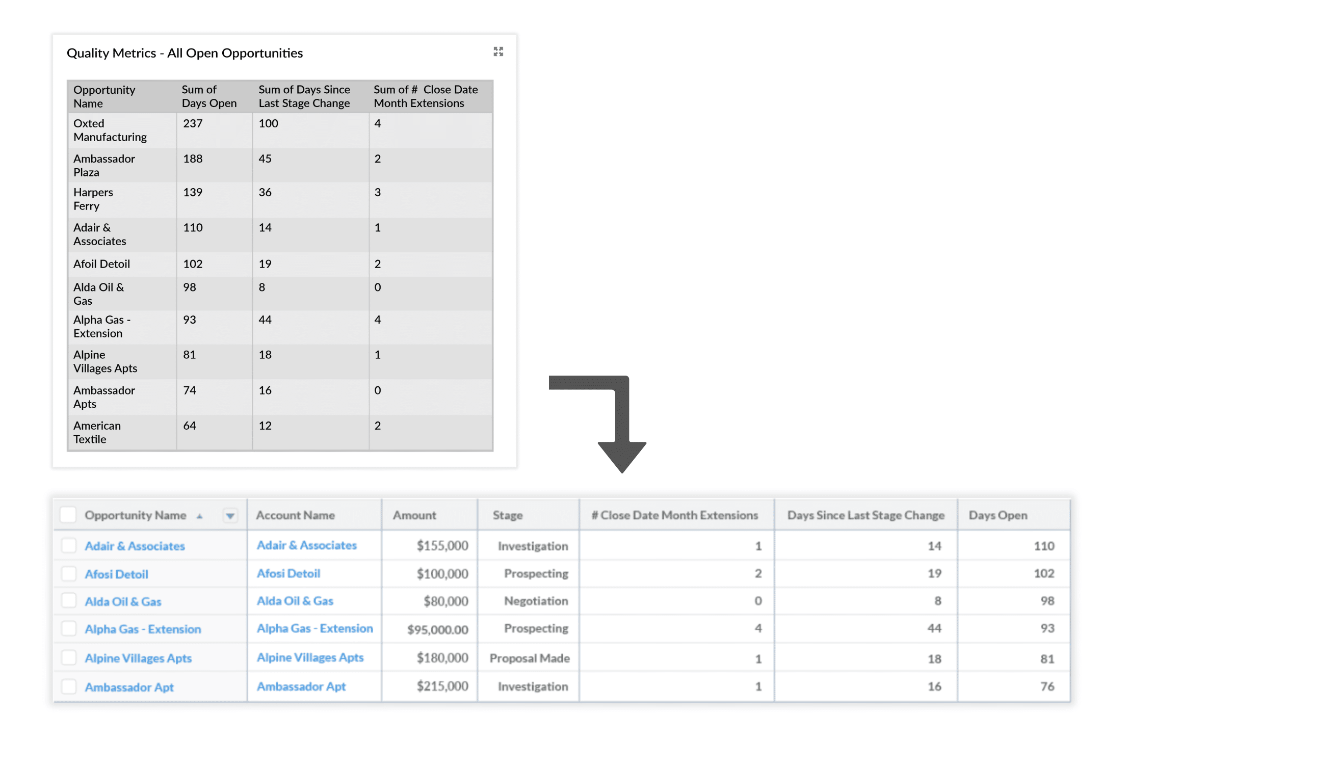 Showing the information on a dashboard table is an excellent way of focusing attention on the top Accounts. Limit the dashboard table results to the top 5, 10, or 15. Then on the report, list all Accounts with open deals.
