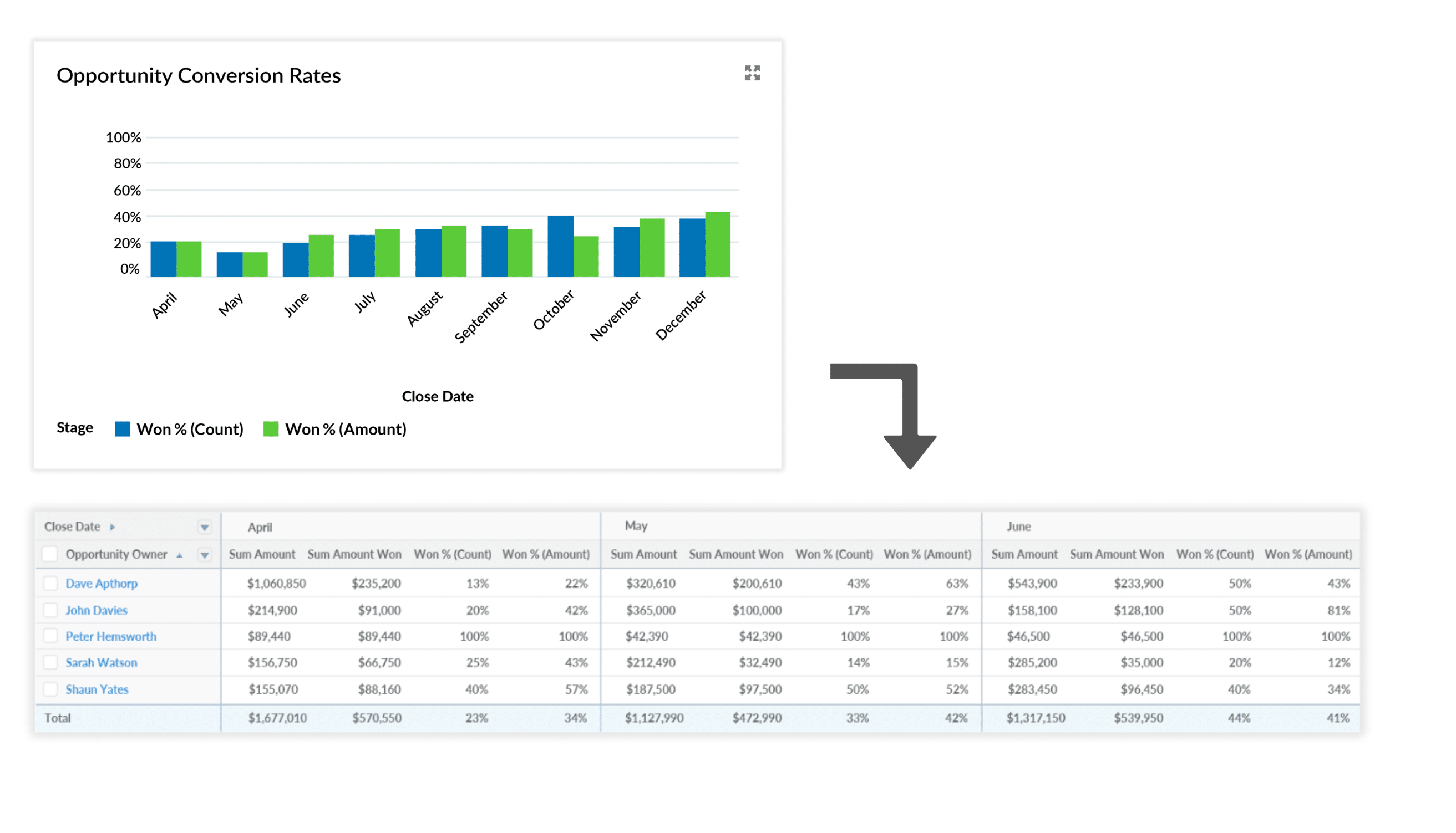 The Opportunity Conversion Rate chart tracks the win rate in two ways: