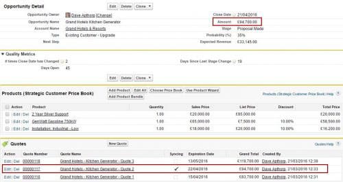 The Opportunity Products reflect the products that had been added to Quote #2. And the value of the opportunity is the same as the value of Quote #2. It’s this value that will be reflected in the sales pipeline but we’ve still got a record of the other two quotes that have been given to the customer.