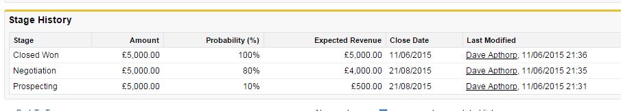 Have a look at the screenshot below. It’s the Stage History taken from the page layout of an Opportunity that moved from Negotiation to Closed Won.