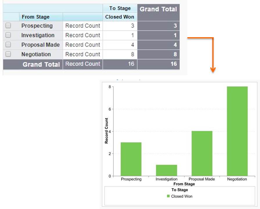 Have a look at the Salesforce report below. It shows, for the last quarter, the “From” Opportunity Stage for all deals that were set to Closed Won.